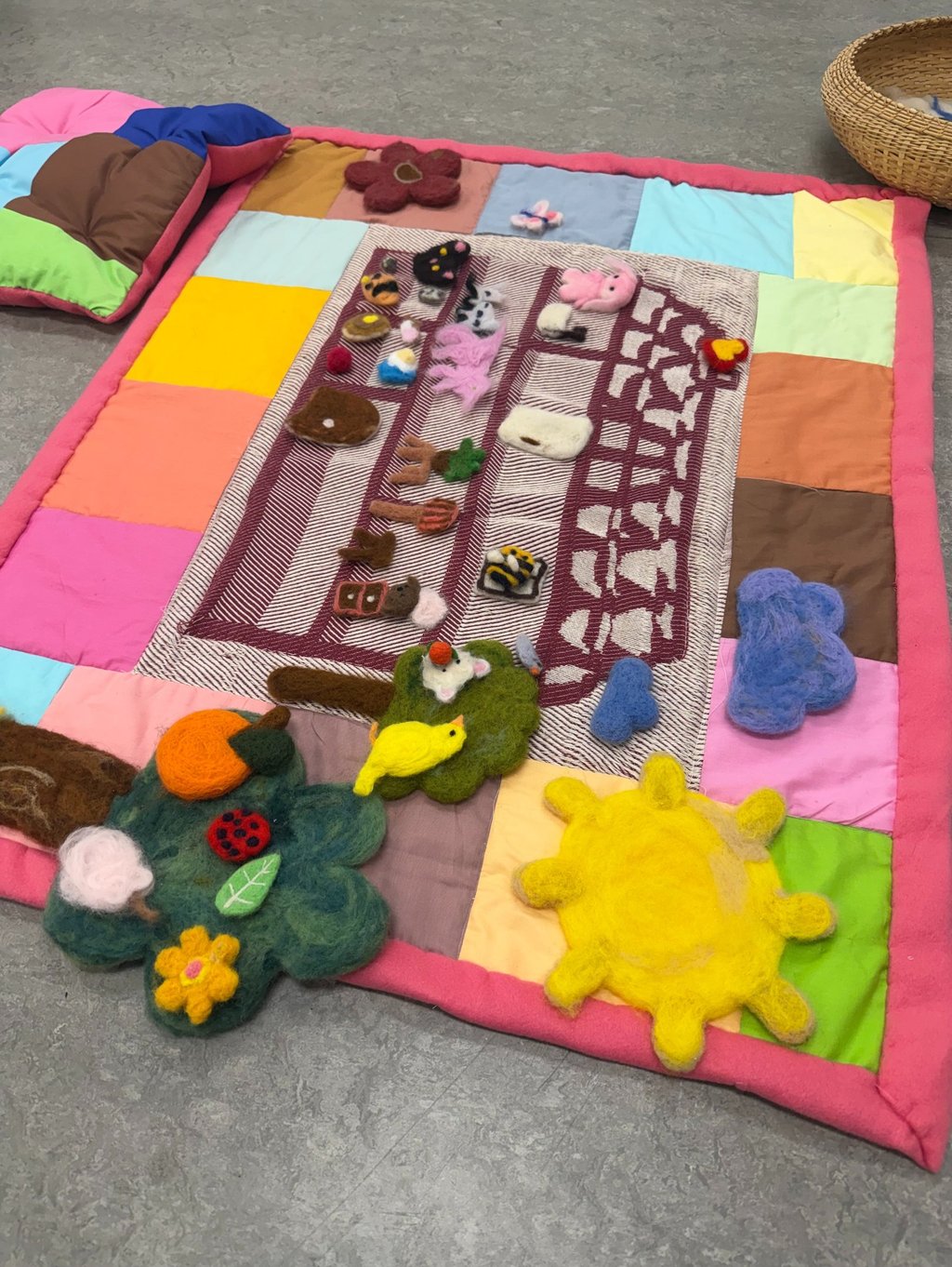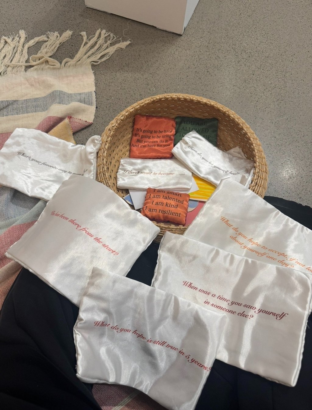 Talking about mental health can feel intimidating and many people avoid engaging with it because of stigma. The bright colors and visual softness in my work act as an entry point, lowering the barrier to engagement and making the work feel accessible. Often, people approach the works without realizing they are entering a space for reflection. They pick up a prompt from the basket, begin reading, and slowly start thinking and journaling.