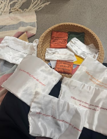 Talking about mental health can feel intimidating and many people avoid engaging with it because of stigma. The bright colors and visual softness in my work act as an entry point, lowering the barrier to engagement and making the work feel accessible. Often, people approach the works without realizing they are entering a space for reflection. They pick up a prompt from the basket, begin reading, and slowly start thinking and journaling.